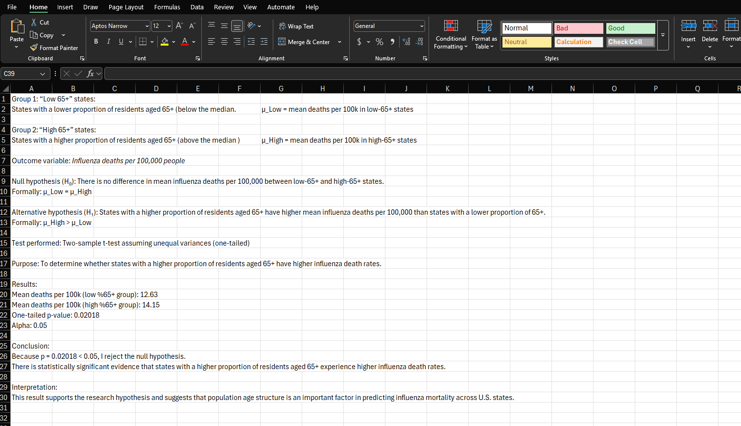 The analysis identified a measurable relationship between age demographics and influenza mortality. States with a higher proportion of residents aged 65 and older tend to experience increased mortality rates. While the correlation is moderate (0.24), statistical testing confirms that the difference between high-age and low-age states is significant, supporting the hypothesis that demographic structure influences influenza outcomes.