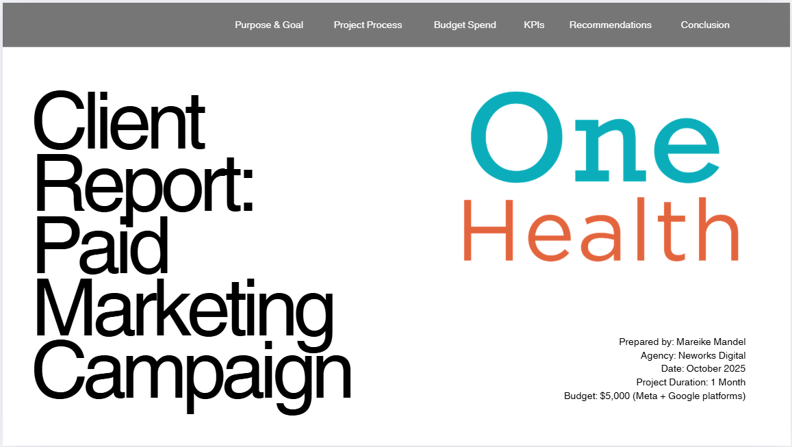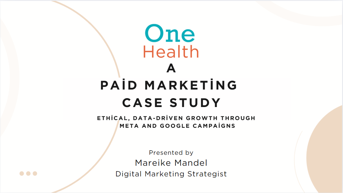 This project demonstrates my ability to take a client from brand repositioning and organic strategy all the way to full-funnel paid marketing execution. Working with One Health required a blend of content strategy, performance marketing, health communication ethics, and data analysis — ultimately helping an established healthcare brand modernize and enter the digital health space with clarity and impact.